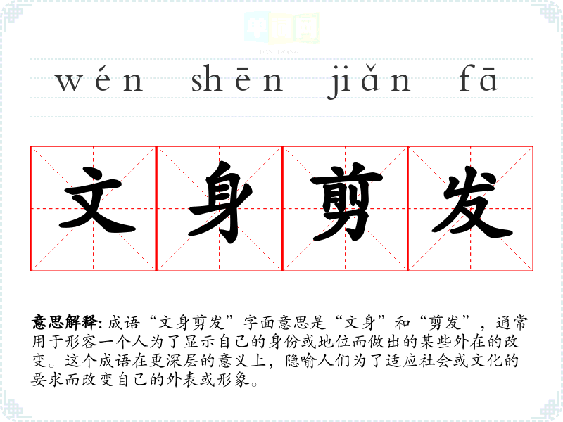 成语“文身剪发”字面意思是“文身”和“剪发”,通常用于形容一个人为了显示自己的身份或地位而做出的某些外在的改变。这个成语在更深层的意义上,隐喻人们为了适应社会或文化的要求而改变自己的外表或形象。