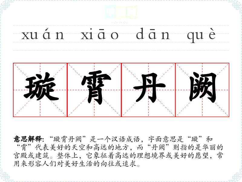 “璇霄丹阙”是一个汉语成语,字面意思是“璇”和“霄”代表美好的天空和高远的地方,而“丹阙”则指的是华丽的宫殿或建筑。整体上,它象征着高远的理想境界或美好的愿望,常用来形容人们对美好生活的向往或追求。