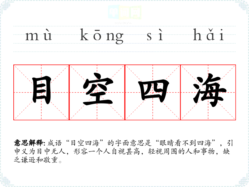 成语“目空四海”的字面意思是“眼睛看不到四海”,引申义为目中无人,形容一个人自视甚高,轻视周围的人和事物,缺乏谦逊和敬重。