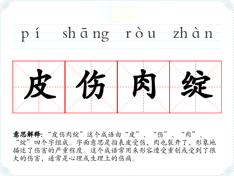 “皮伤肉绽”这个成语由“皮”、“伤”、“肉”、“绽”四个字组成。字面意思是指表皮受伤,肉也裂开了,形象地描述了伤害的严重程度。这个成语常用来形容遭受重创或受到了很大的伤害,通常是心理或生理上的伤痛。