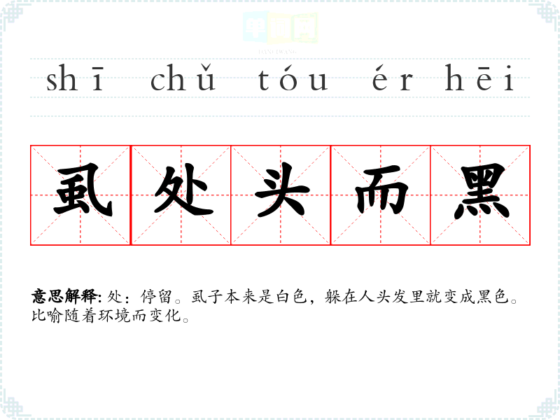| 虱处头而黑 | 处:停留。虱子本来是白色,躲在人头发里就变成黑色。比喻随着环境而变化。 |