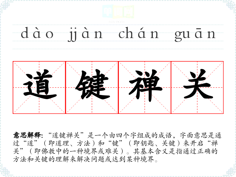 “道键禅关”是一个由四个字组成的成语,字面意思是通过“道”(即道理、方法)和“键”(即钥匙、关键)来开启“禅关”(即**中的一种境界或难关)。其基本含义是指通过正确的方法和关键的理解来解决问题或达到某种境界。