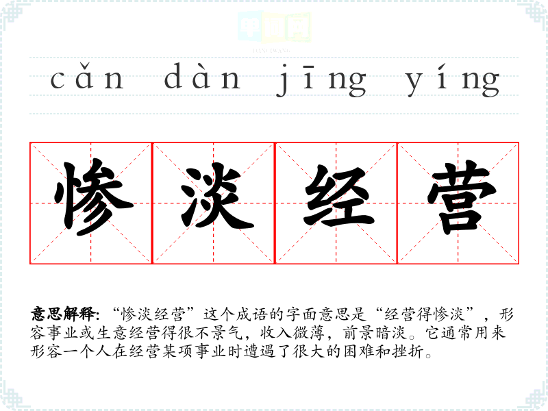 “惨淡经营”这个成语的字面意思是“经营得惨淡”,形容事业或生意经营得很不景气,收入微*,前景暗淡。它通常用来形容一个人在经营某项事业时遭遇了很大的困难和挫折。
