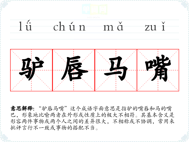 “驴唇马嘴”这个成语字面意思是指驴的嘴唇和马的嘴巴,形象地比喻两者在外形或性质上的极大不相符。其基本含义是形容两件事物或两个人之间的差异很大,不相称或不协调,常用来批评言行不一致或事物的搭配不当。