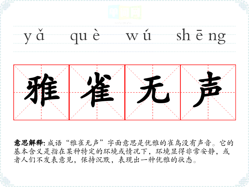 成语“雅雀无声”字面意思是优雅的雀鸟没有声音。它的基本含义是指在某种特定的环境或情况下,环境显得非常安静,或者人们不发表意见,保持沉默,表现出一种优雅的状态。