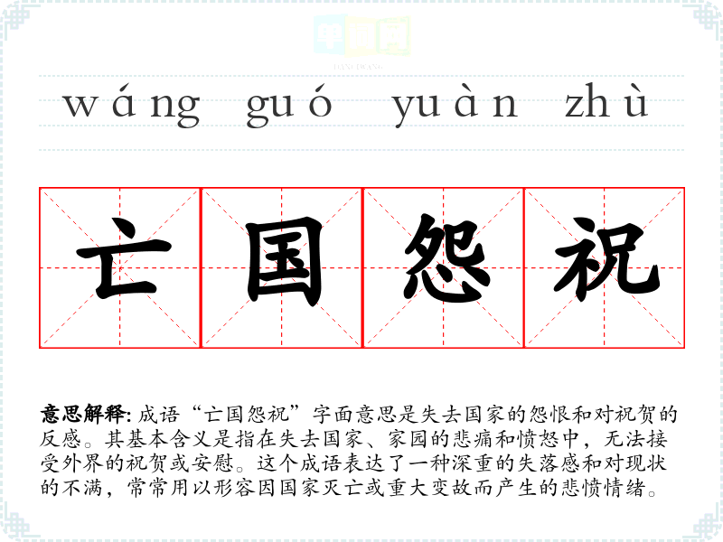 成语“亡国怨祝”字面意思是失去国家的怨恨和对祝贺的反感。其基本含义是指在失去国家、家园的悲痛和愤怒中,无法接受外界的祝贺或安慰。这个成语表达了一种深重的失落感和对现状的不满,常常用以形容因国家灭亡或重大变故而产生的悲愤情绪。