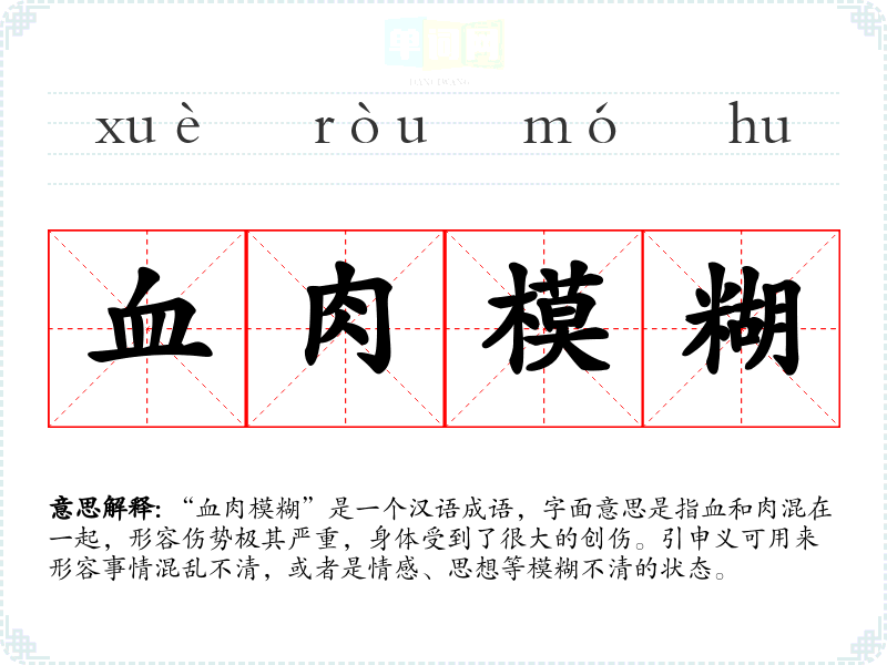 “血肉模糊”是一个汉语成语,字面意思是指血和肉混在一起,形容伤势极其严重,身体受到了很大的创伤。引申义可用来形容事情混乱不清,或者是情感、思想等模糊不清的状态。