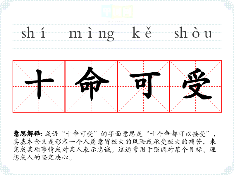 成语“十命可受”的字面意思是“十个命都可以接受”,其基本含义是形容一个人愿意冒极大的风险或承受极大的痛苦,来完成某项事情或对某人表示忠诚。这通常用于强调对某个目标、理想或人的坚定决心。