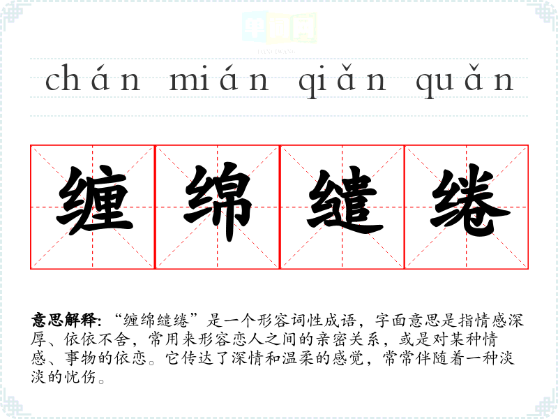“缠绵缱绻”是一个形容词性成语,字面意思是指情感深厚、依依不舍,常用来形容恋人之间的亲密关系,或是对某种情感、事物的依恋。它传达了深情和温柔的感觉,常常伴随着一种淡淡的忧伤。