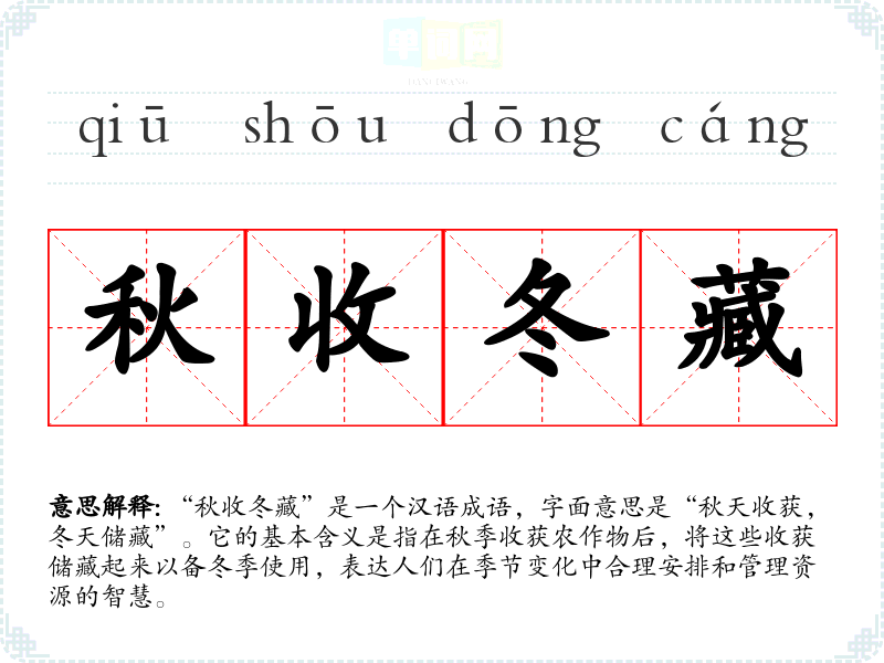 “秋收冬藏”是一个汉语成语,字面意思是“秋天收获,冬天储藏”。它的基本含义是指在秋季收获农作物后,将这些收获储藏起来以备冬季使用,表达人们在季节变化中合理安排和管理资源的智慧。