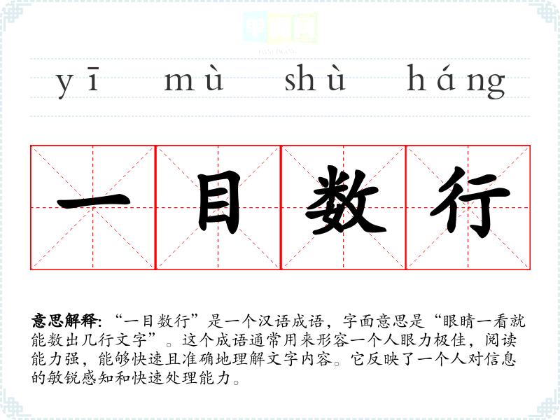 “一目数行”是一个汉语成语,字面意思是“眼睛一看就能数出几行文字”。这个成语通常用来形容一个人眼力极佳,阅读能力强,能够快速且准确地理解文字内容。它反映了一个人对信息的敏锐感知和快速处理能力。