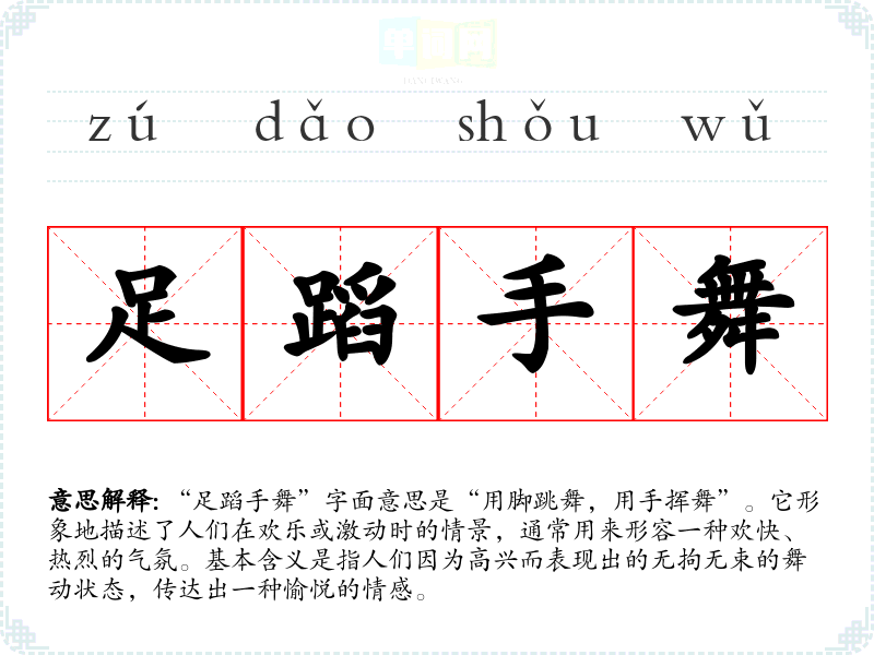 “足蹈手舞”字面意思是“用脚跳舞,用手挥舞”。它形象地描述了人们在欢乐或激动时的情景,通常用来形容一种欢快、热烈的气氛。基本含义是指人们因为高兴而表现出的无拘无束的舞动状态,传达出一种愉悦的情感。