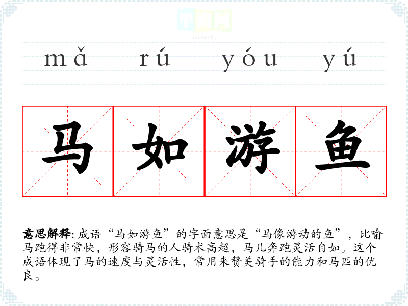 成语“马如游鱼”的字面意思是“马像游动的鱼”,比喻马跑得非常快,形容骑马的人骑术高超,马儿奔跑灵活自如。这个成语体现了马的速度与灵活性,常用来赞美骑手的能力和马匹的优良。