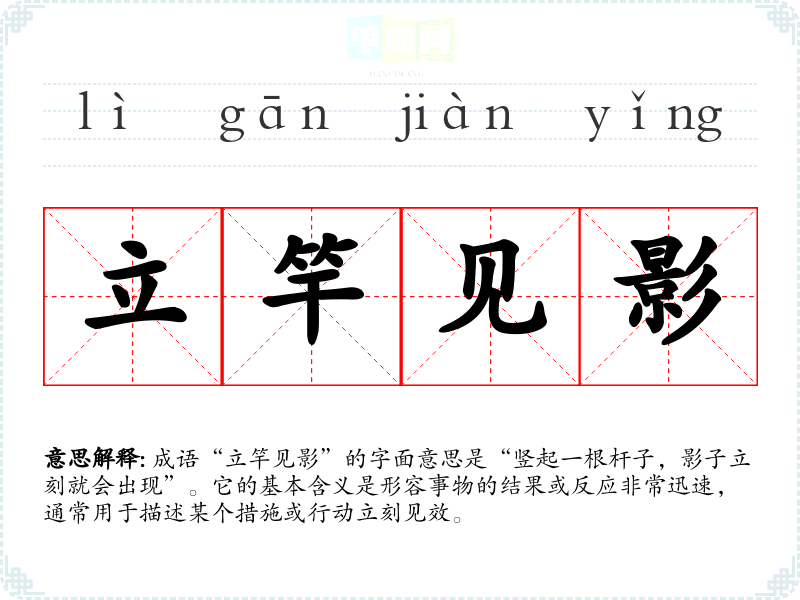 成语“立竿见影”的字面意思是“竖起一根杆子,影子立刻就会出现”。它的基本含义是形容事物的结果或反应非常迅速,通常用于描述某个措施或行动立刻见效。