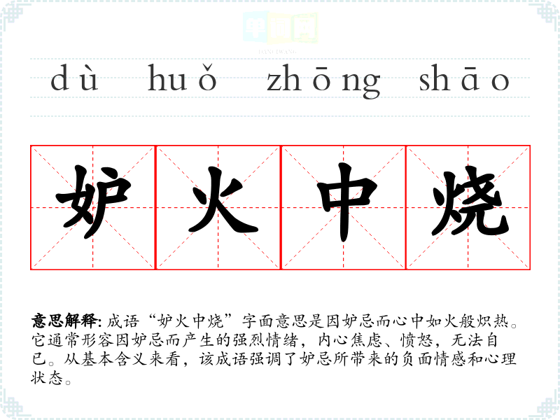 成语“妒火中烧”字面意思是因妒忌而心中如火般炽热。它通常形容因妒忌而产生的强烈情绪,内心焦虑、愤怒,无法自已。从基本含义来看,该成语强调了妒忌所带来的负面情感和心理状态。