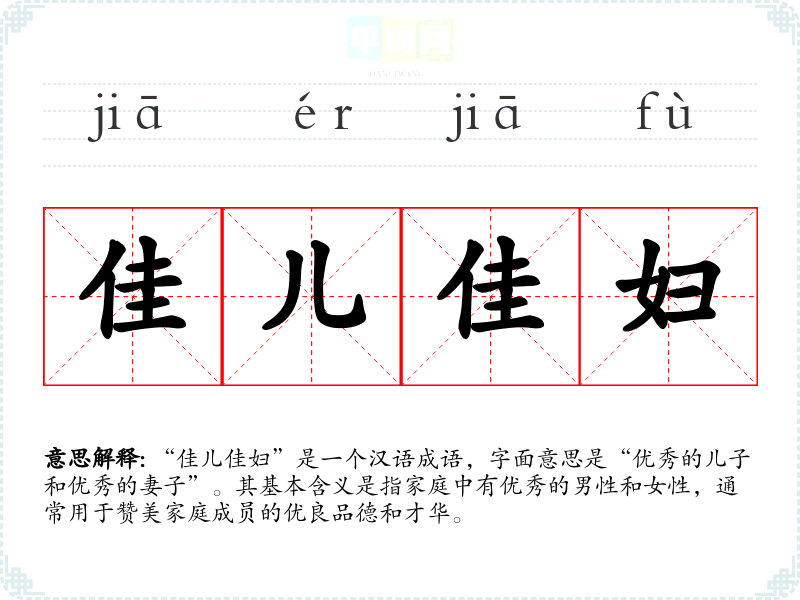 “佳儿佳妇”是一个汉语成语,字面意思是“优秀的儿子和优秀的妻子”。其基本含义是指家庭中有优秀的男性和女性,通常用于赞美家庭成员的优良品德和才华。