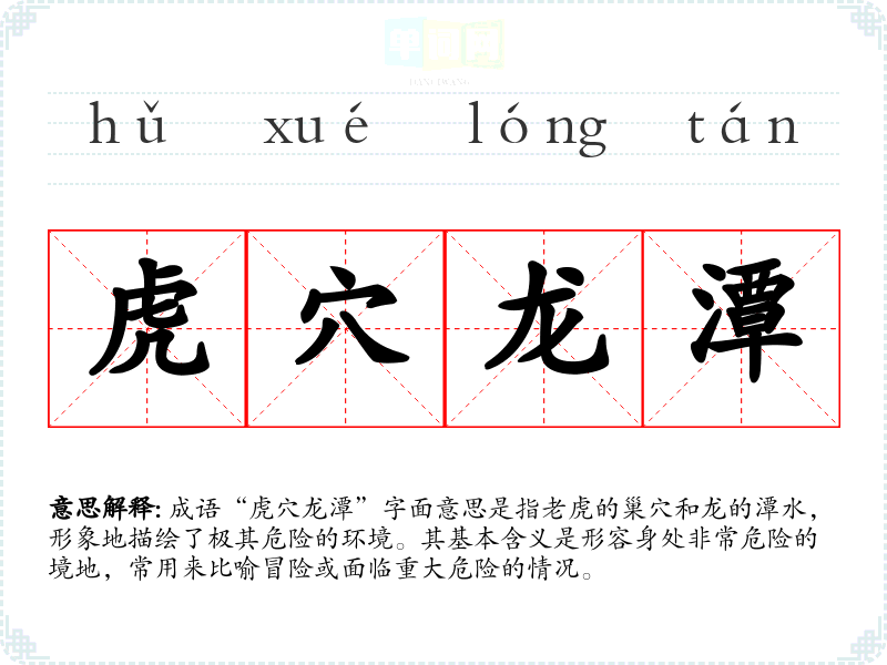 | 虎窟龙潭 | 窟:洞穴;潭:深水池。龙居住的深水潭,虎栖身的巢穴。比喻极其凶险的地方。 |