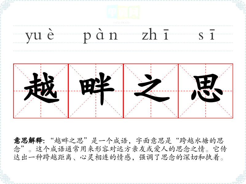 “越畔之思”是一个成语,字面意思是“跨越水塘的思念”。这个成语通常用来形容对远方亲友或爱人的思念之情。它传达出一种跨越距离、心灵相连的情感,强调了思念的深切和执着。