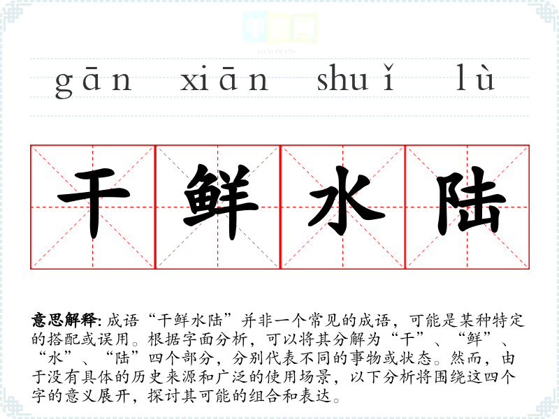 从字面上看,“干鲜水陆”可以理解为一种对比,可能指代在不同环境(干燥与潮湿、陆地与水面)下的状态,或某种综合体。