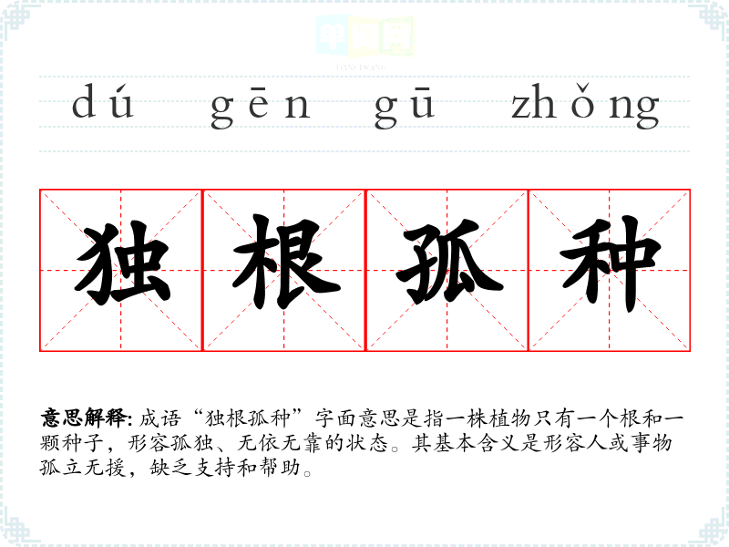 成语“独根孤种”字面意思是指一株植物只有一个根和一颗种子,形容孤独、无依无靠的状态。其基本含义是形容人或事物孤立无援,缺乏支持和帮助。