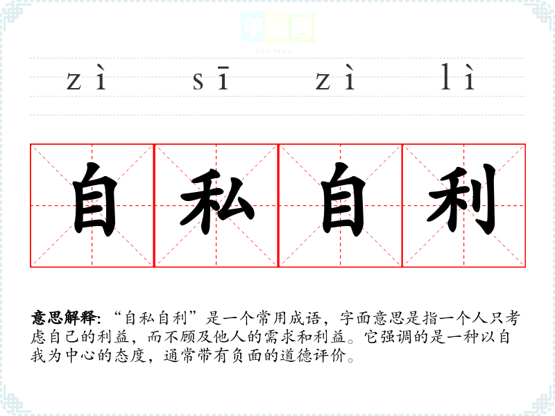 “自私自利”是一个常用成语,字面意思是指一个人只考虑自己的利益,而不顾及他人的需求和利益。它强调的是一种以自我为中心的态度,通常带有负面的道德评价。