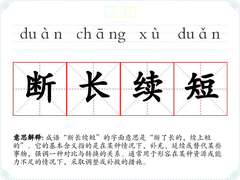 成语“断长续短”的字面意思是“断了长的,续上短的”。它的基本含义指的是在某种情况下,补充、延续或替代某些事物,强调一种对比与转换的关系。通常用于形容在某种资源或能力不足的情况下,采取调整或补救的措施。