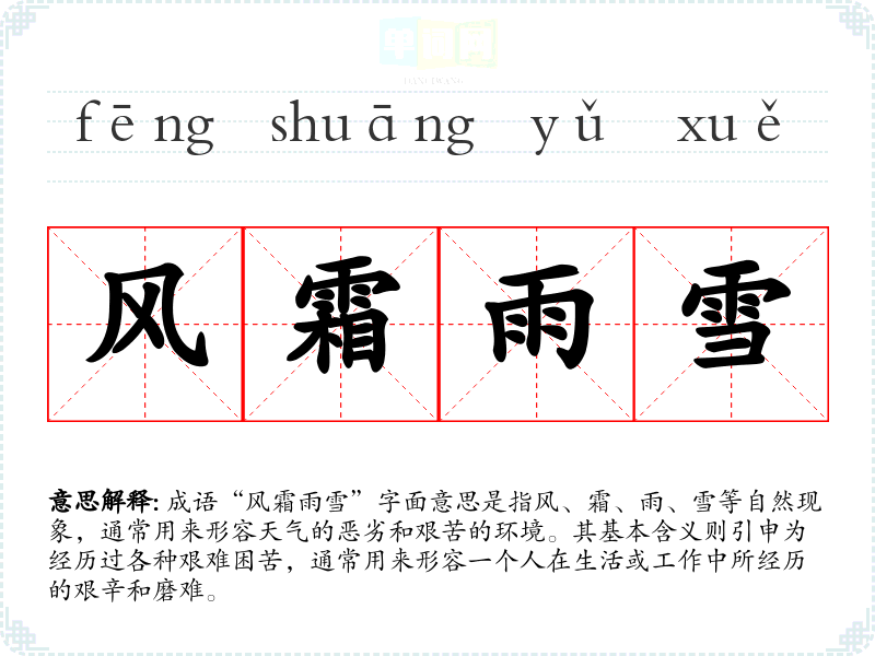 “风霜雨雪”并没有明确的文学出处,但作为一种自然现象的集合,它反映了传统文化中对自然的观察与感悟。该成语常用于描述人们在生活中的种种艰难险阻,体现了古代文人对生活的深刻理解。