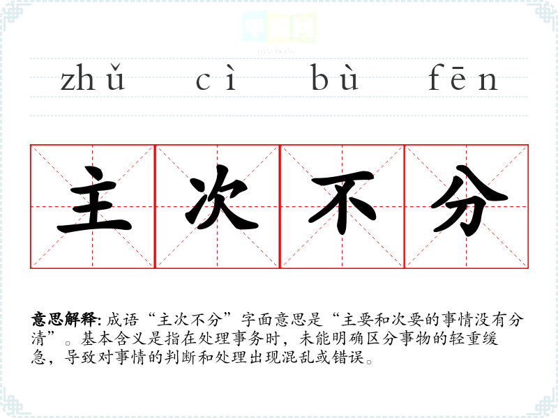 成语“主次不分”字面意思是“主要和次要的事情没有分清”。基本含义是指在处理事务时,未能明确区分事物的轻重缓急,导致对事情的判断和处理出现混乱或错误。