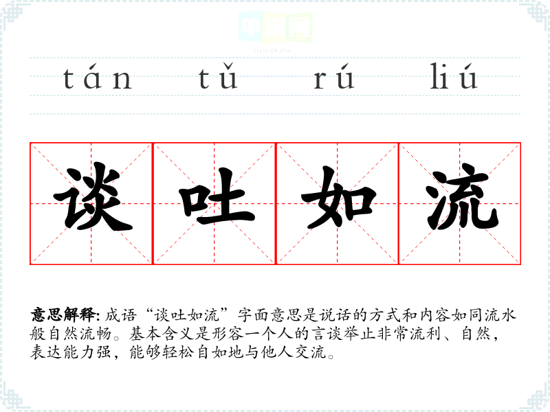 成语“谈吐如流”字面意思是说话的方式和内容如同流水般自然流畅。基本含义是形容一个人的言谈举止非常流利、自然,表达能力强,能够轻松自如地与他人交流。