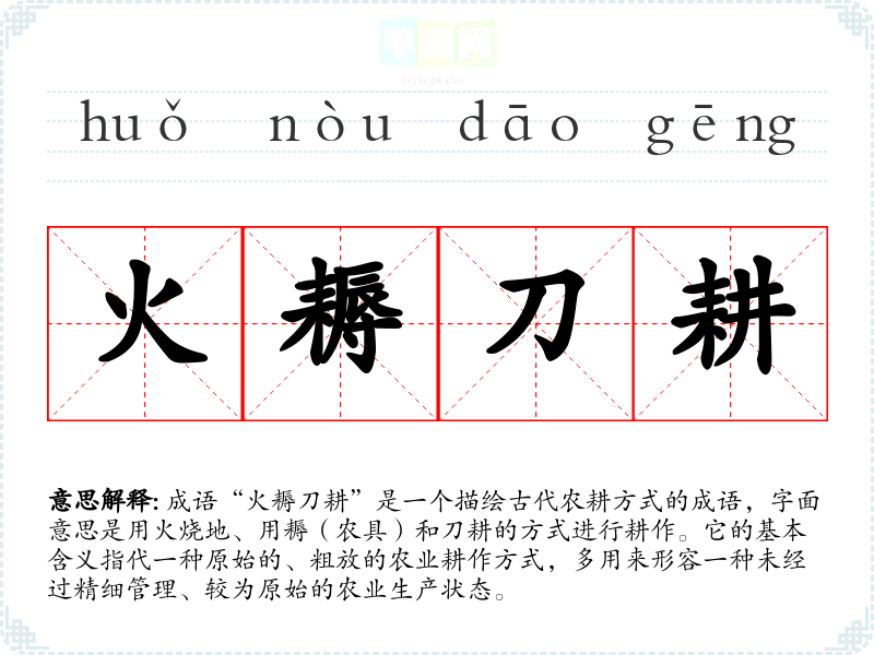 成语“火耨刀耕”是一个描绘古代农耕方式的成语,字面意思是用火烧地、用耨(农具)和刀耕的方式进行耕作。它的基本含义指代一种原始的、粗放的农业耕作方式,多用来形容一种未经过精细管理、较为原始的农业生产状态。