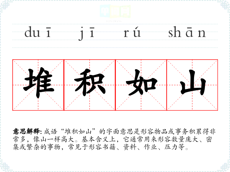 成语“堆积如山”的字面意思是形容物品或事务积累得非常多,像山一样高大。基本含义上,它通常用来形容数量庞大、密集或繁杂的事物,常见于形容书籍、资料、作业、压力等。