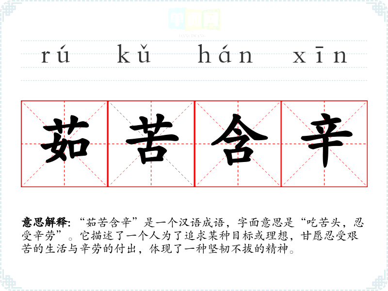 “茹苦含辛”是一个汉语成语,字面意思是“吃苦头,忍受辛劳”。它描述了一个人为了追求某种目标或理想,甘愿忍受艰苦的生活与辛劳的付出,体现了一种坚韧不拔的精神。
