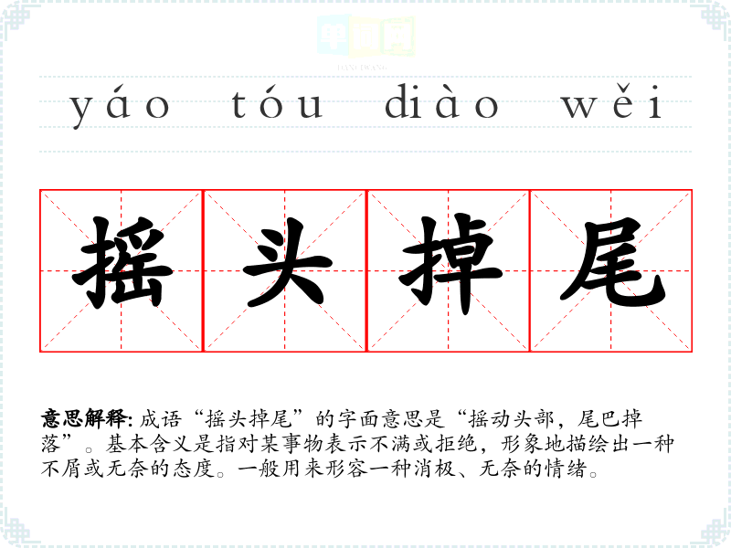 成语“摇头掉尾”的字面意思是“摇动头部,尾巴掉落”。基本含义是指对某事物表示不满或拒绝,形象地描绘出一种不屑或无奈的态度。一般用来形容一种消极、无奈的情绪。