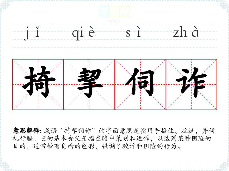 成语“掎挈伺诈”的字面意思是指用手掐住、拉扯,并伺机行骗。它的基本含义是指在暗中策划和运作,以达到某种阴险的目的,通常带有负面的色彩,强调了狡诈和阴险的行为。