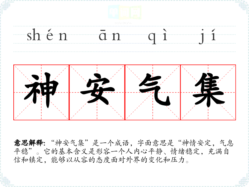 “神安气集”是一个成语,字面意思是“神情安定,气息平稳”。它的基本含义是形容一个人内心平静、情绪稳定,充满自信和镇定,能够以从容的态度面对外界的变化和压力。