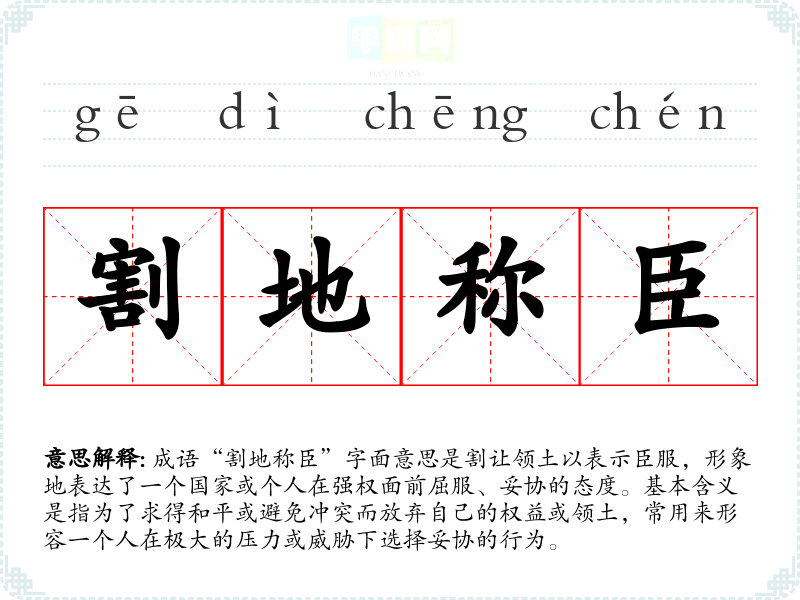 成语“割地称臣”字面意思是割让领土以表示臣服,形象地表达了一个国家或个人在强权面前屈服、妥协的态度。基本含义是指为了求得和平或避免冲突而放弃自己的权益或领土,常用来形容一个人在极大的压力或威胁下选择妥协的行为。