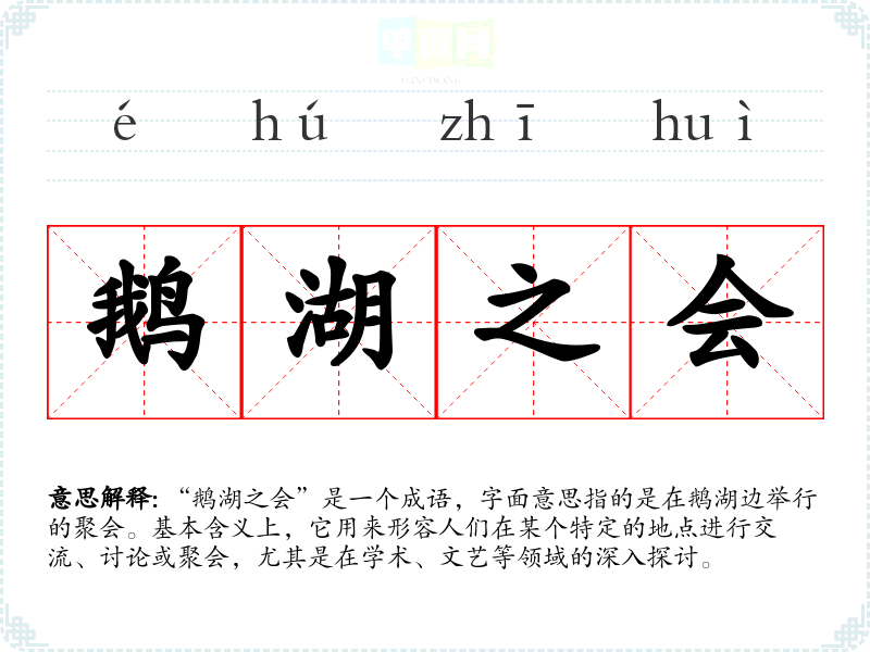 “鹅湖之会”是一个成语,字面意思指的是在鹅湖边举行的聚会。基本含义上,它用来形容人们在某个特定的地点进行交流、讨论或聚会,尤其是在学术、文艺等领域的深入探讨。