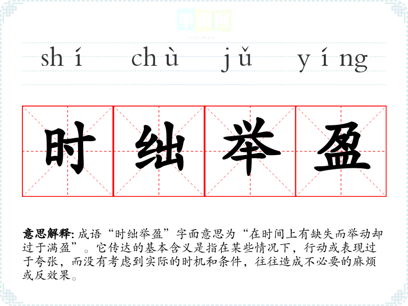成语“时绌举盈”字面意思为“在时间上有缺失而举动却过于满盈”。它传达的基本含义是指在某些情况下,行动或表现过于夸张,而没有考虑到实际的时机和条件,往往造成不必要的麻烦或反效果。