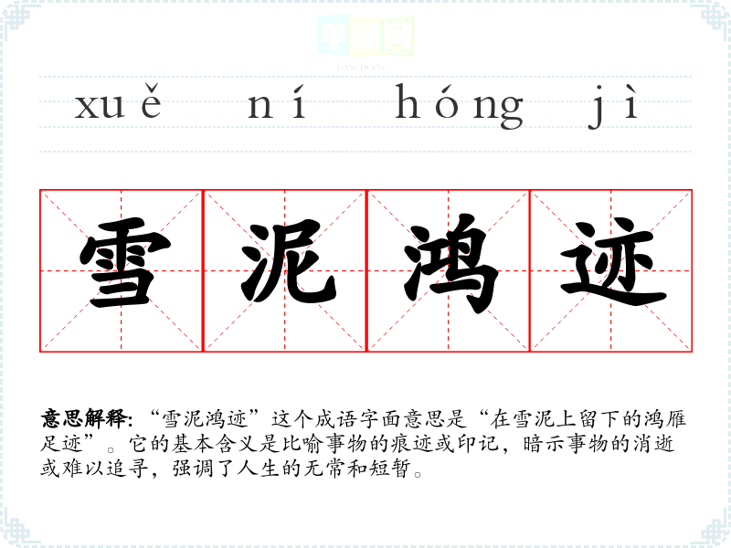 “雪泥鸿迹”这个成语字面意思是“在雪泥上留下的鸿雁足迹”。它的基本含义是比喻事物的痕迹或印记,暗示事物的消逝或难以追寻,强调了人生的无常和短暂。