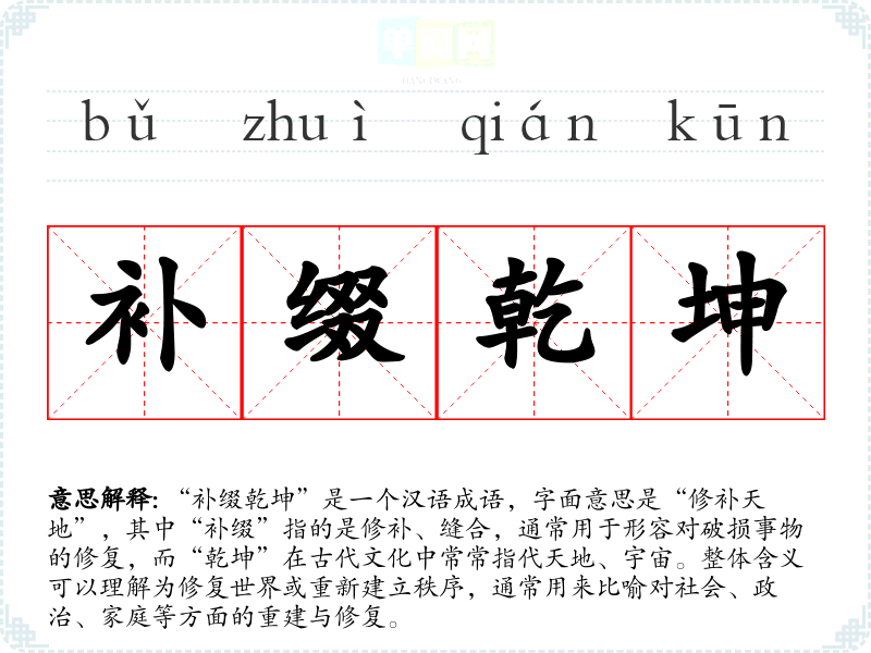 “补缀乾坤”是一个汉语成语,字面意思是“修补天地”,其中“补缀”指的是修补、缝合,通常用于形容对破损事物的修复,而“乾坤”在古代文化中常常指代天地、宇宙。整体含义可以理解为修复世界或重新建立秩序,通常用来比喻对社会、政治、家庭等方面的重建与修复。