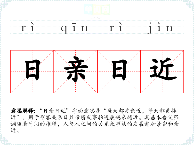 “日亲日近”常用于形容亲友之间的关系,比如家庭成员、朋友在交往中愈发亲密。它也可以用于描述工作伙伴、团队成员之间的默契度提升。常见于日常对话、文学作品以及演讲中,表达一种积极向上的人际关系。