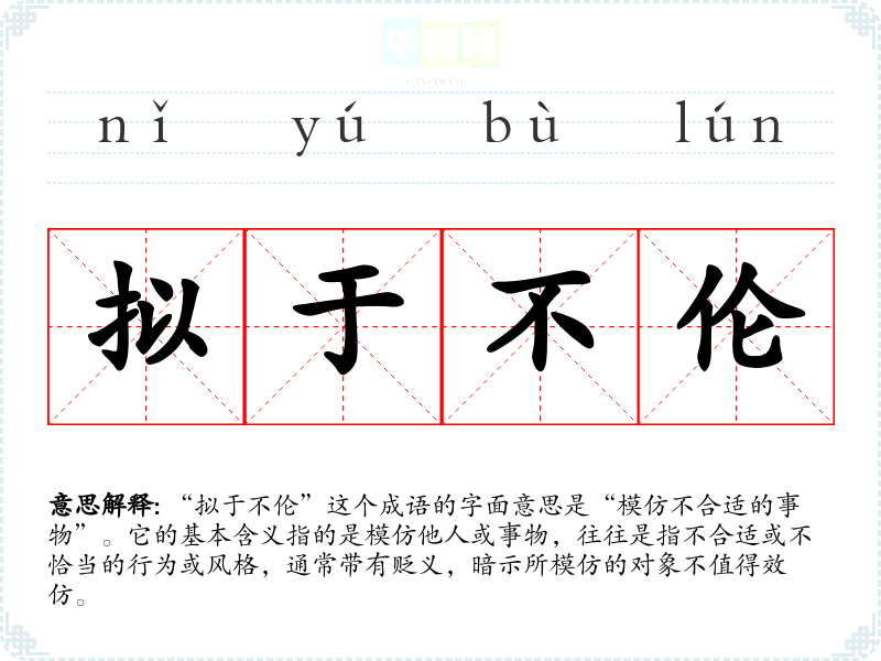 “拟于不伦”这个成语的字面意思是“模仿不合适的事物”。它的基本含义指的是模仿他人或事物,往往是指不合适或不恰当的行为或风格,通常带有贬义,暗示所模仿的对象不值得效仿。
