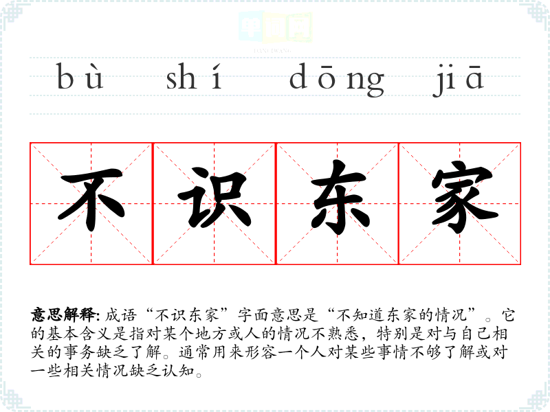 成语“不识东家”字面意思是“不知道东家的情况”。它的基本含义是指对某个地方或人的情况不熟悉,特别是对与自己相关的事务缺乏了解。通常用来形容一个人对某些事情不够了解或对一些相关情况缺乏认知。