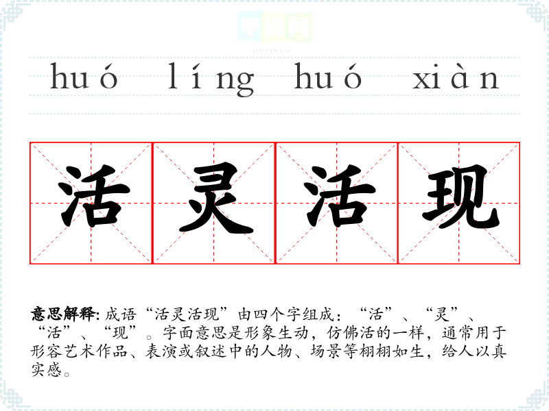 | 活灵活现 | 形容神情逼真,使人感到好像亲眼看到一般。 |