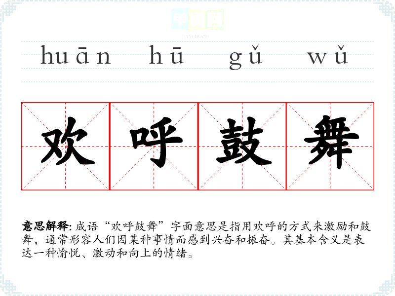 成语“欢呼鼓舞”字面意思是指用欢呼的方式来激励和鼓舞,通常形容人们因某种事情而感到兴奋和振奋。其基本含义是表达一种愉悦、激动和向上的情绪。