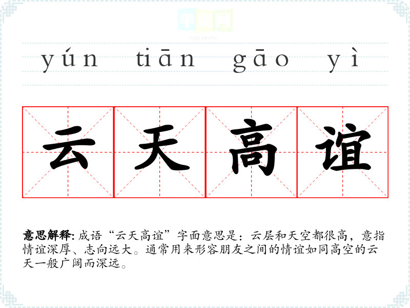 成语“云天高谊”字面意思是:云层和天空都很高,意指情谊深厚、志向远大。通常用来形容朋友之间的情谊如同高空的云天一般广阔而深远。