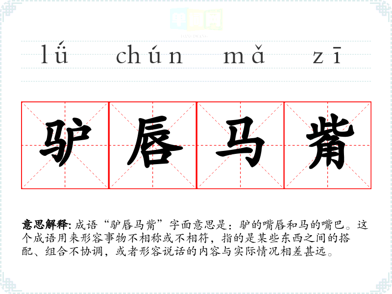 成语“驴唇马觜”字面意思是:驴的嘴唇和马的嘴巴。这个成语用来形容事物不相称或不相符,指的是某些东西之间的搭配、组合不协调,或者形容说话的内容与实际情况相差甚远。