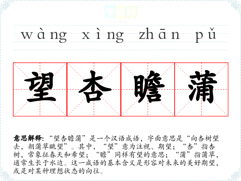 “望杏瞻蒲”是一个汉语成语,字面意思是“向杏树望去,朝蒲草眺望”。其中,“望”意为注视、期望;“杏”指杏树,常象征春天和希望;“瞻”同样有望的意思;“蒲”指蒲草,通常生长于水边。这一成语的基本含义是形容对未来的美好期望,或是对某种理想状态的向往。
