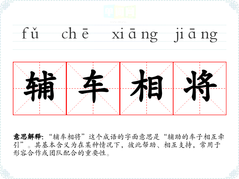 “辅车相将”这个成语的字面意思是“辅助的车子相互牵引”。其基本含义为在某种情况下,彼此帮助、相互支持,常用于形容合作或团队配合的重要性。