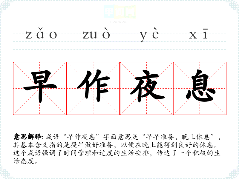 成语“早作夜息”字面意思是“早早准备,晚上休息”,其基本含义指的是提早做好准备,以便在晚上能得到良好的休息。这个成语强调了时间管理和适度的生活安排,传达了一个积极的生活态度。